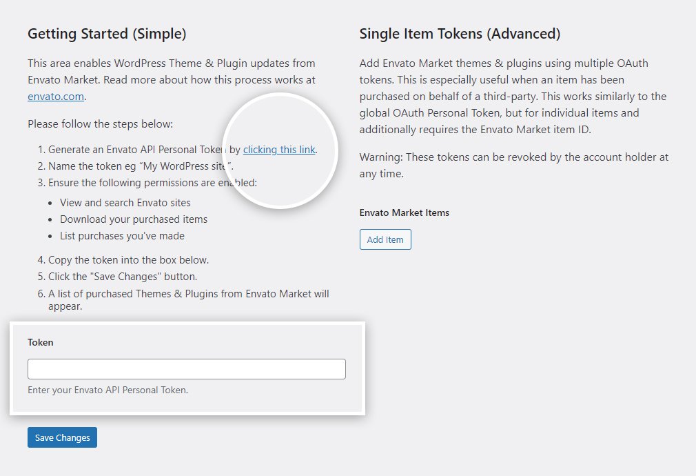Step 3 – Enter your Envato API from the ‘Token’ field. With the use of a secure OAuth token and the powerful Envato API the plugin can deliver a smooth item installation and update experience for WordPress customers.