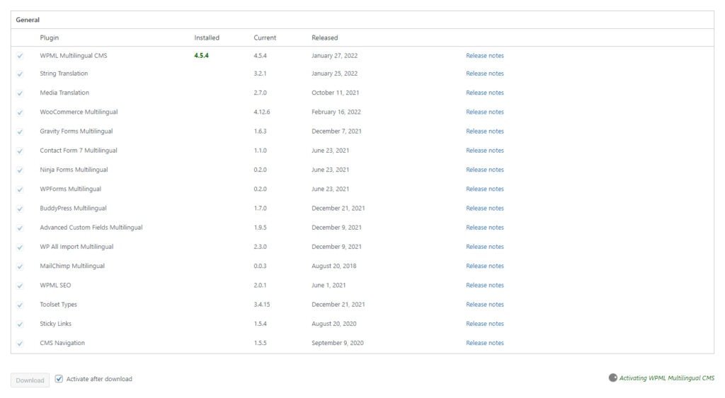 After purchasing WPML, you will have the following plugins. Basically, to use WPML, you just need to install the WPML Multilingual CMS or the OTGS Installer. One of these plugins will get you the WPML plugin. You can check the list below for other plugins and extensions.