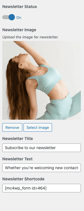 To activate/deactivate and customize the popup, navigate to Appearance > Customize > General > Newsletter Settings, where you can enable or disable the popup status.